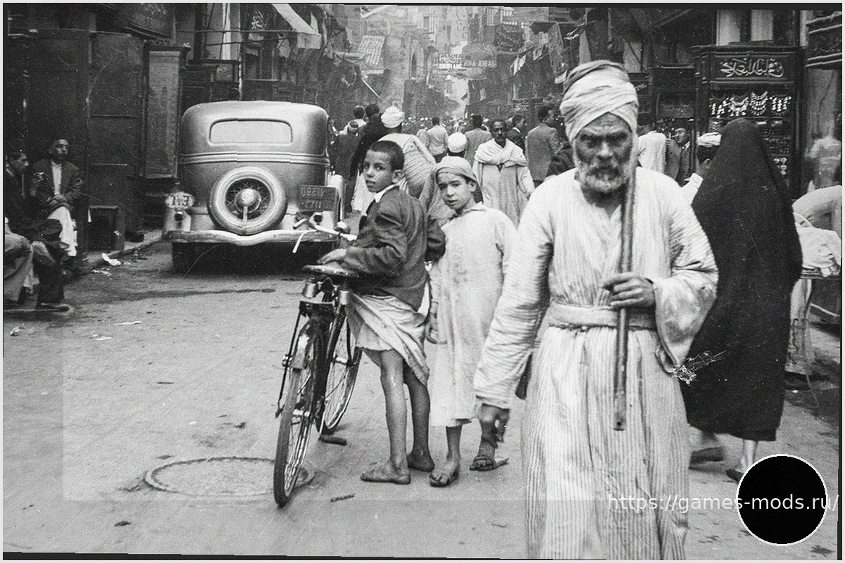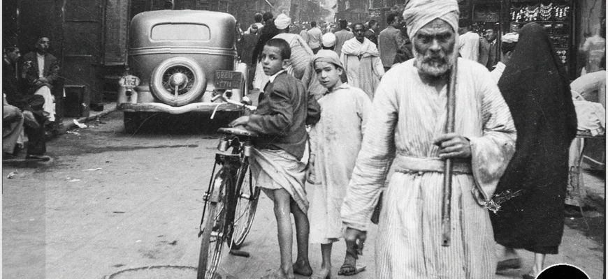 На оживленной улице в кадр попал момент повседневной городской жизни: мужчина в европейском костюме и феске (тарбуше) уверенно шагает сквозь пеструю толпу, где смешались эпохи и стили.