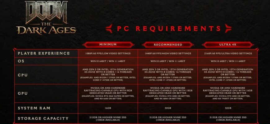 Bethesda и Id Software опубликовали системные требования для Doom: The Dark Ages на ПК. Они предоставили спецификации для минимальных, рекомендуемых и ультра настроек, и требования значительно выше, чем у Doom Eternal.