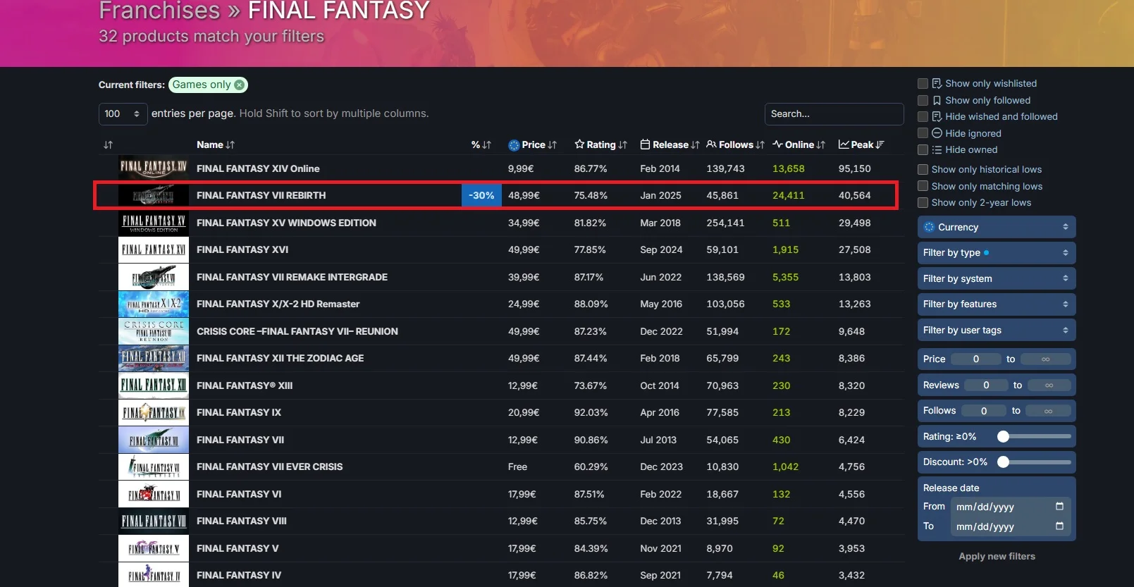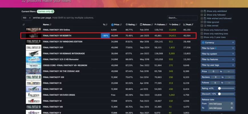 После недавнего релиза на PC, Final Fantasy VII Rebirth установила новый рекорд по числу одновременных игроков на Steam среди одиночных игр серии. В минувшие выходные в ремейк культовой RPG, изначально вышедший на PS5 в феврале 2024 года, одновременно играло более 40 000 человек.