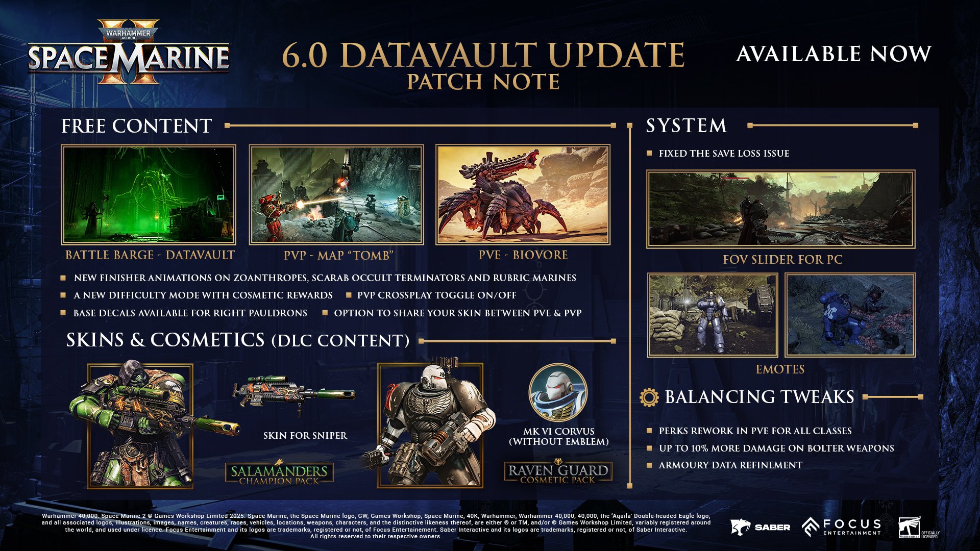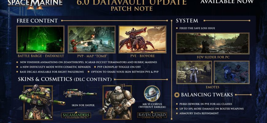 Focus Entertainment выпустила крупное обновление Datavault для Warhammer 40,000: Space Marine 2. Оно добавляет новый бесплатный контент, уровень сложности и карту, а также улучшения качества жизни.