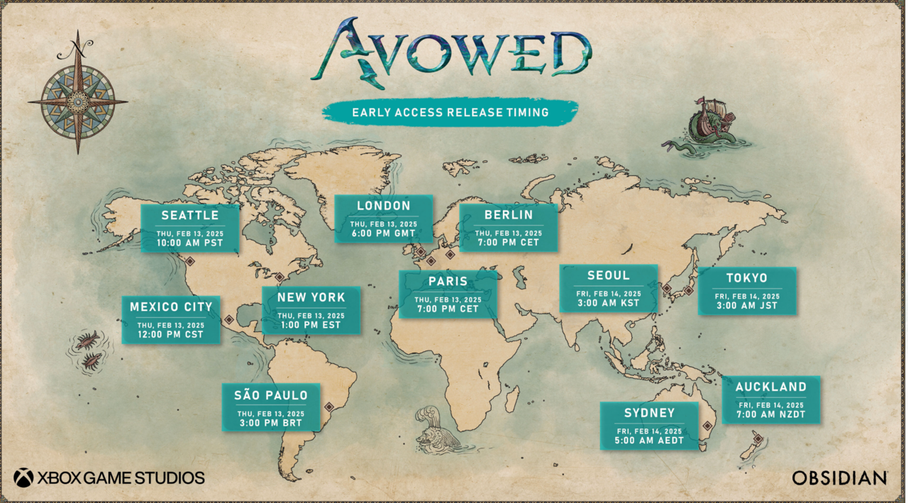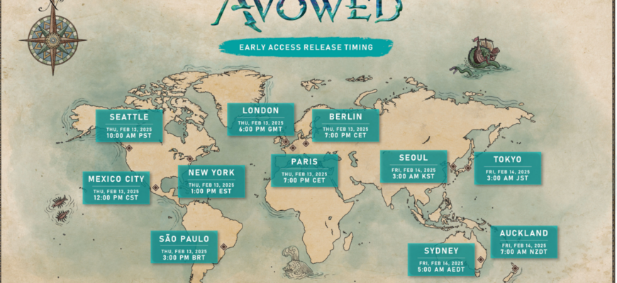 Разработчики опубликовали официальное расписание разблокировки раннего доступа к Avowed. Он стартует 13 февраля в следующее время: